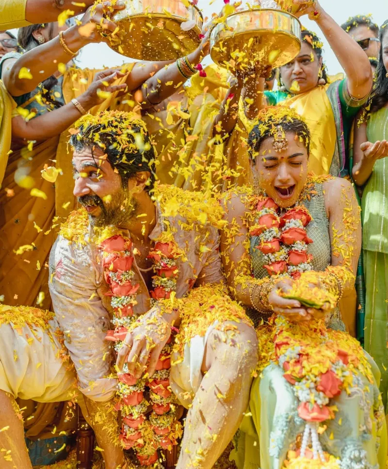 हल्दी सेरेमनी की फोटोज में दोनों के चेहरे पर हल्दी लगी हुई है, हाथ में पान का पत्ता है और उन पर फूलों की बारिश होती दिखाई दे रही है. लगभग हर फोटो में कपल एक-दूसरे का हाथ थामे हुए नजर आ रहा है और दोनों की केमिस्ट्री फैंस को काफी पसंद आ रही है.