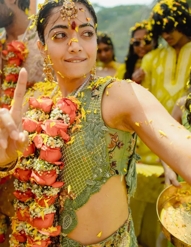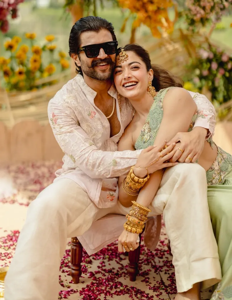 इस खास मौके पर रश्मिका ने ग्रीन वन-शोल्डर टॉप के साथ मैचिंग स्कर्ट पहनी थी, जबकि विजय देवरकोंडा व्हाइट कुर्ता-पायजामा में दिखाई दिए. शादी की तरह हल्दी सेरेमनी में भी दोनों ने गोल्ड ज्वेलरी पहनी थी.