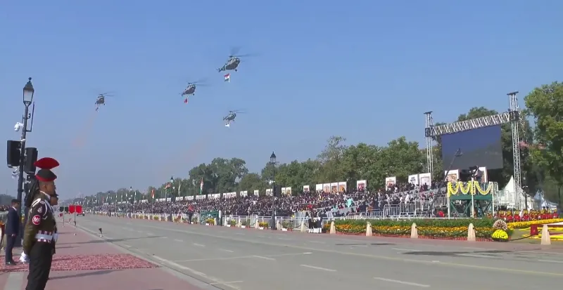 दिल्ली में कर्तव्य पथ पर 129 हेलीकॉप्टर यूनिट के चार Mi-17 1V हेलीकॉप्टरों द्वारा ध्वज फॉर्मेशन में फूलों की पंखुड़ियां बरसाई जा रही हैं. हेलीकॉप्टरों के इस फॉर्मेशन का नेतृत्व ग्रुप कैप्टन आलोक अहलावत कर रहे हैं.